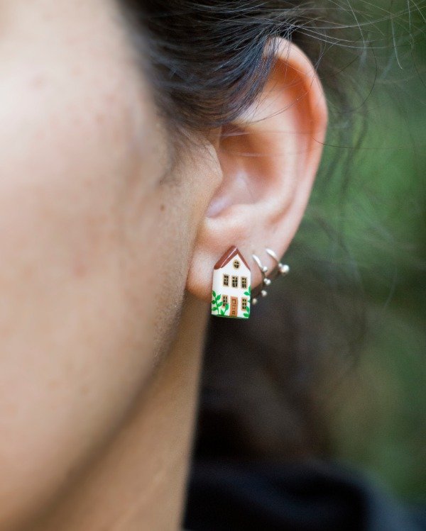Par de aretes hechos a mano en porcelana fría, pintados y barnizados. Pasantes de acero quirúrgico.