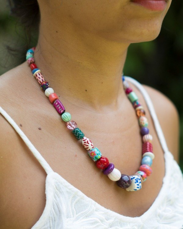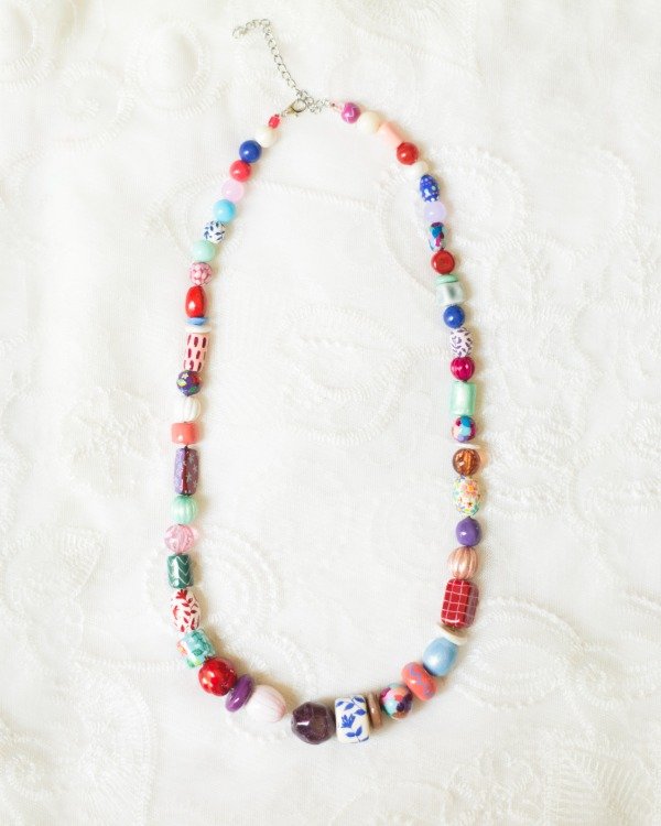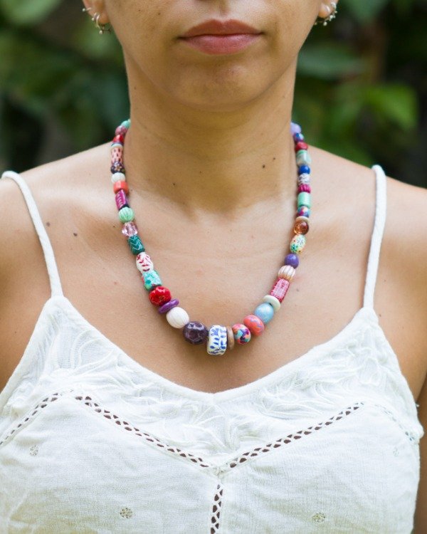 Collar de cuentas modeladas, pintadas y barnizadas a mano en porcelana fría y algunas cuentas de vidrio y de cristal facetado. Mosquetones y cadena de extensión de acero quirúrgico.