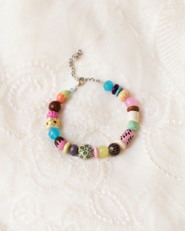 Pulsera artesanal hecha con cuentas modeladas en porcelana fría, pintadas y barnizadas a mano. Mosquetón y cadena de extensión de acero quirúrgico.