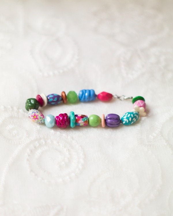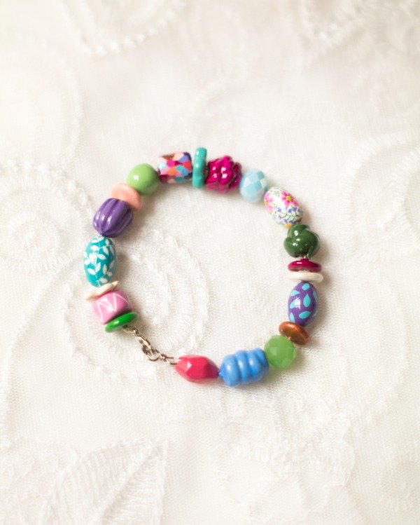 Pulsera artesanal hecha con cuentas modeladas en porcelana fría, pintadas y barnizadas a mano. Cierres de mosquetones de acero quirúrgico.
