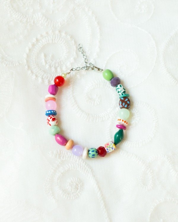 Pulsera artesanal hecha con cuentas modeladas en porcelana fría, pintadas y barnizadas a mano. Mosquetón y cadena de extensión de acero quirúrgico.