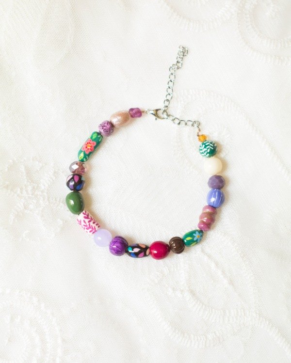 Pulsera artesanal hecha con cuentas modeladas en porcelana fría, pintadas y barnizadas a mano. Mosquetón y cadena de extensión de acero quirúrgico.