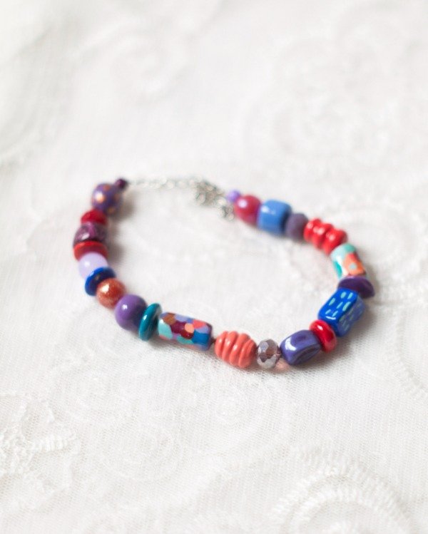 Pulsera de cuentas modeladas, pintadas y barnizadas a mano en porcelana fría y algunas cuentas de vidrio y de cristal facetado. Mosquetón y cadena de extensión de acero quirúrgico.