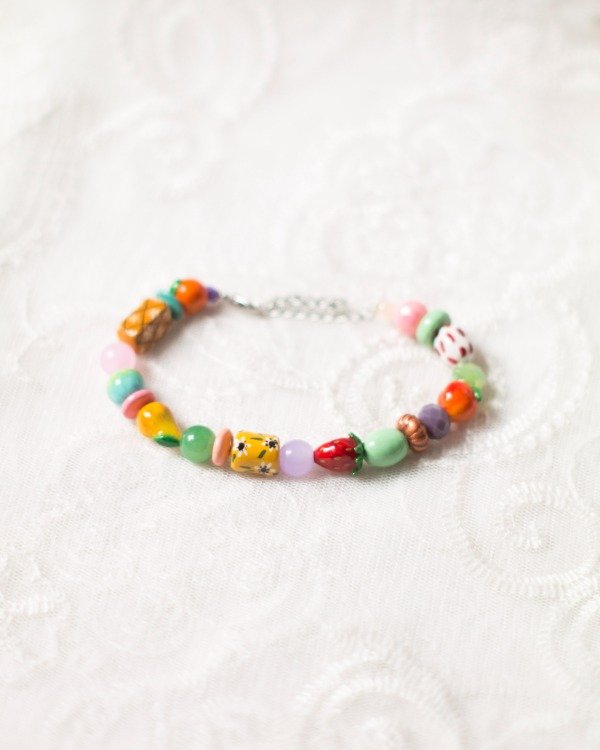 Pulsera de cuentas modeladas, pintadas y barnizadas a mano en porcelana fría y algunas cuentas de vidrio y de cristal facetado. Mosquetón y cadena de extensión de acero quirúrgico.
