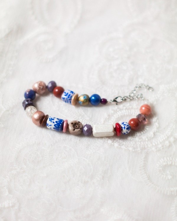 Pulsera de cuentas modeladas, pintadas y barnizadas a mano en porcelana fría y algunas cuentas de vidrio y de cristal facetado. Mosquetón y cadena de extensión de acero quirúrgico.
