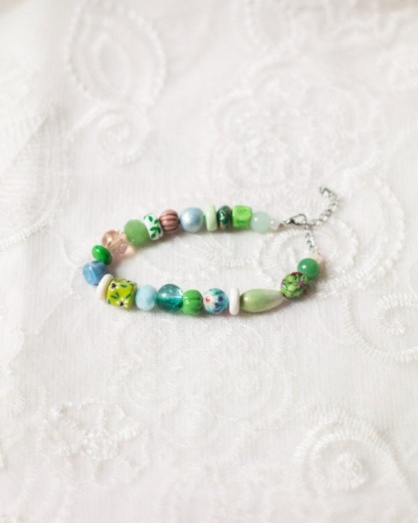 Pulsera de cuentas modeladas, pintadas y barnizadas a mano en porcelana fría y algunas cuentas de vidrio y de cristal facetado. Mosquetón y cadena de extensión de acero quirúrgico.