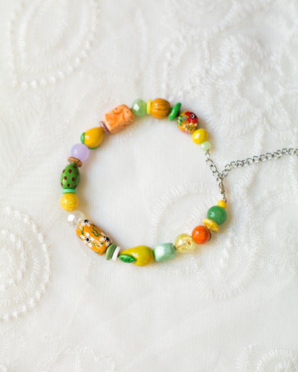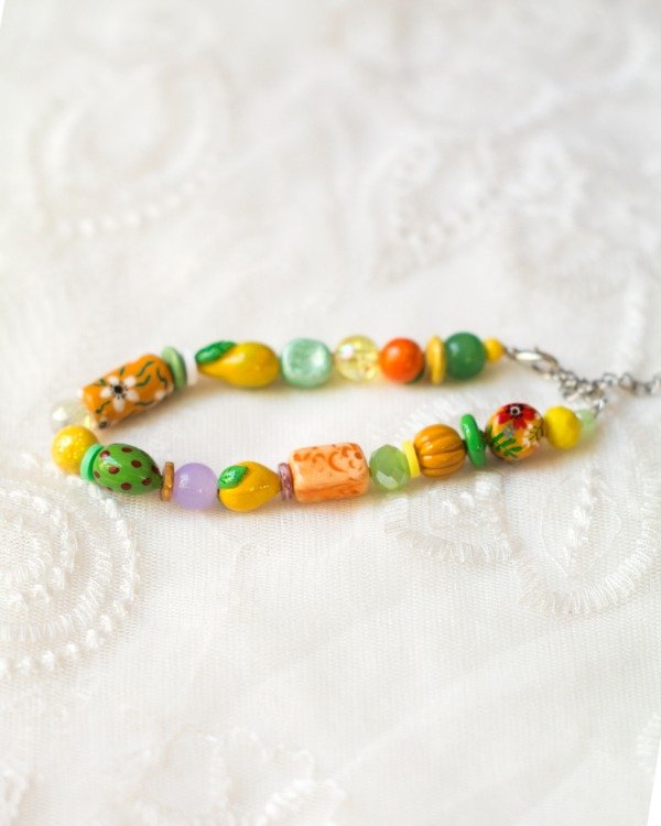 Pulsera de cuentas modeladas, pintadas y barnizadas a mano en porcelana fría y algunas cuentas de vidrio y de cristal facetado. Mosquetón y cadena de extensión de acero quirúrgico.