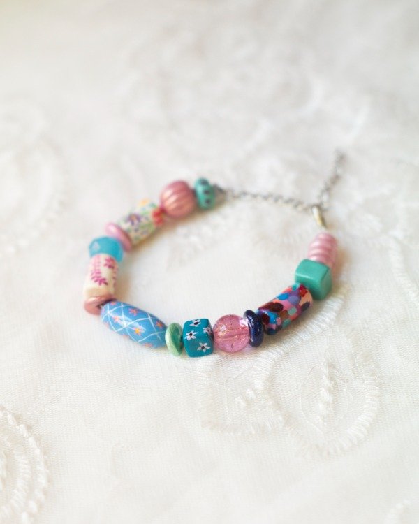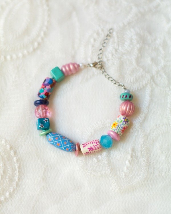 Pulsera de cuentas modeladas, pintadas y barnizadas a mano en porcelana fría y algunas cuentas de vidrio y de cristal facetado. Mosquetón y cadena de extensión de acero quirúrgico.
